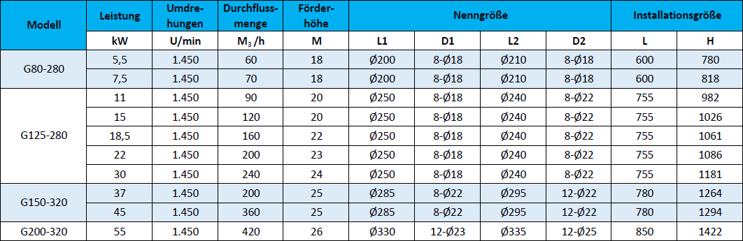 Hauptmodellspezifikationen und Größentabelle der GXB-Pumpe (Einheit: mm)