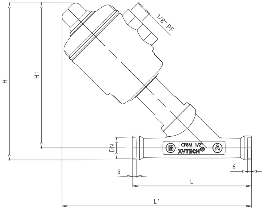 Schematische Darstellung der Hauptabmessungen des Y-förmigen erweiterten pneumatischen Schrägsitzventils