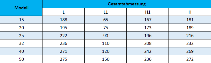 Hauptmaßtabelle und Produktmodellbeschreibung