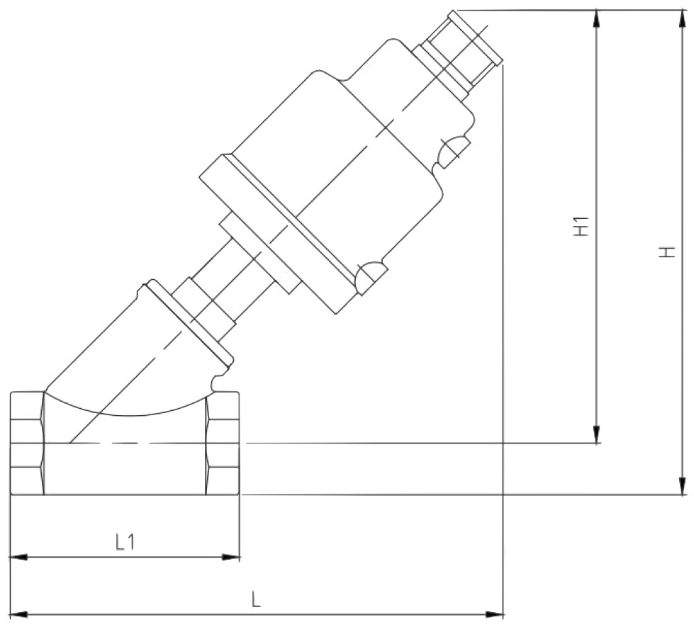 Schematische Darstellung der Hauptabmessungen des pneumatischen Y-Schrägsitzventils aus Edelstahl