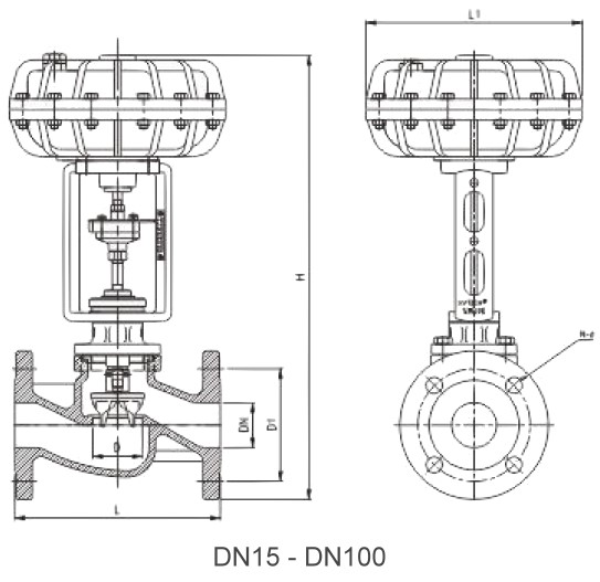 Schematische Darstellung der Hauptabmessungen eines Zweiwege-Flüssigkeitsregelventils